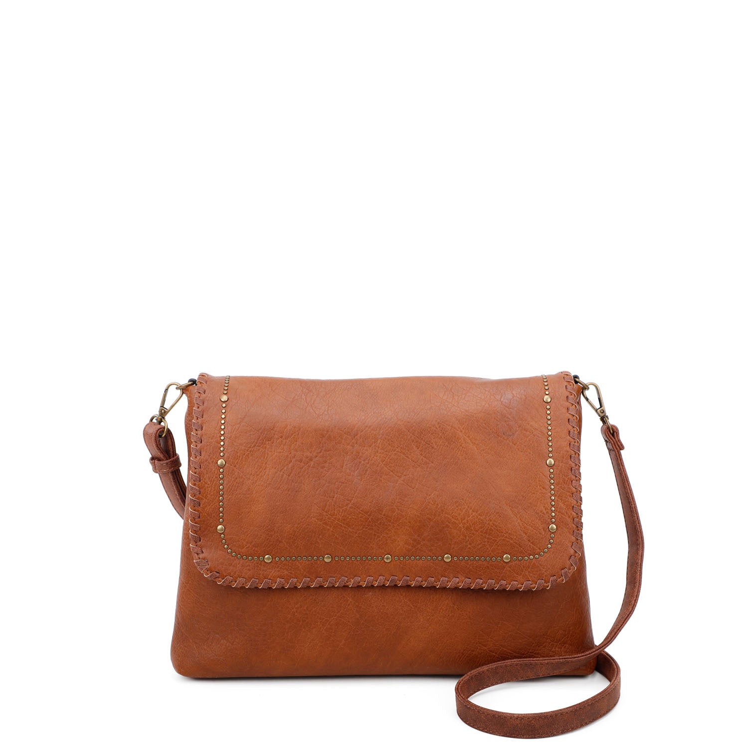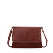 - Western-inspired design with suede woven front flap